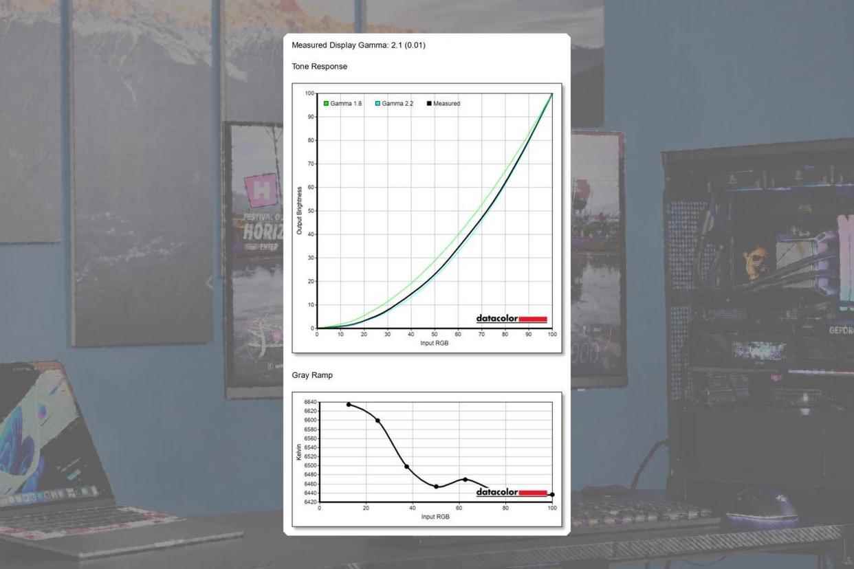 在伽玛曲线测试中,AGON AG276UZD显示器的表现与标准的 Gamma 2.2 曲线 高度吻合。伽马曲线描述了显示器亮度与输入信号之间的关系,理想的伽马值能够确保画面的亮度与对比度均衡,保证图像的真实再现。灰阶测试中,AGON AG276UZD显示器的色温约为 6440K,接近标准的 6500K 日光色温,表现非常稳定。