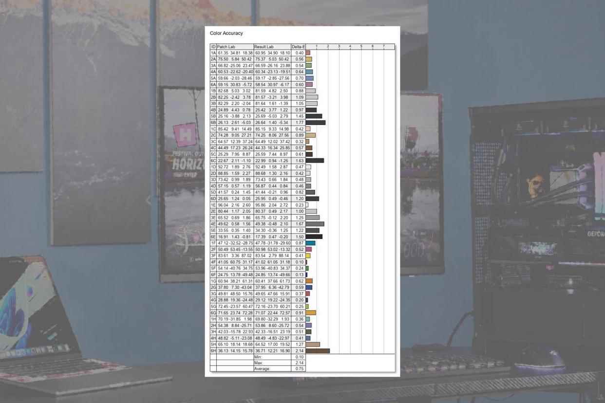 在色彩精确度方面,AGON AG276UZD显示器展现了令人瞩目的性能,实测平均Delta E仅为0.75。Delta E是衡量显示器色彩精确度的标准,数值越低,色彩还原越真实。一般而言,Delta E小于1即被视为专业级显示器的表现,而AGON AG276UZD在出厂设置下即能达到此标准,其性能甚至可与某些专业显示器相媲美。