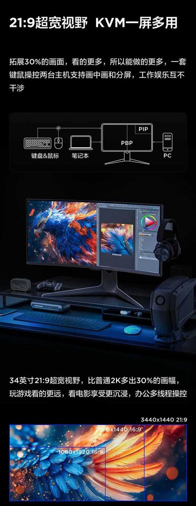 - 普通办公和观影用户:34 英寸的带鱼屏可实现多任务处理,提高办公效率,21:9 的比例和高分辨率在观影时能带来更好的视觉体验,还原电影原生效果。