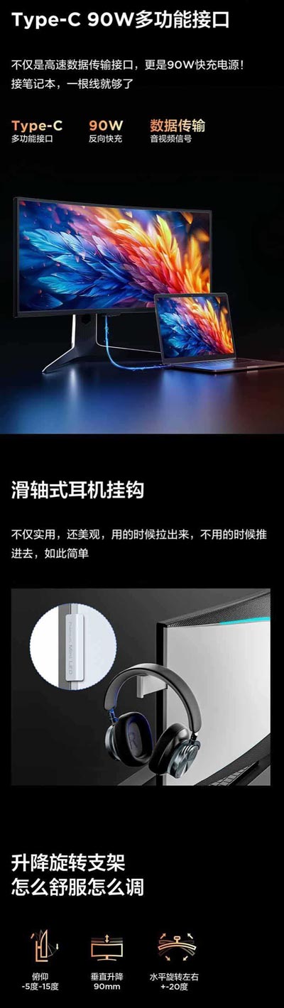 - 电竞玩家:180Hz 高刷新率、1ms 响应时间以及 FreeSync Premium 和 G -SYNC Compatible 防撕裂技术,能带来流畅、无撕裂的游戏画面,1500R 曲率的带鱼屏还能提供更广阔的视野,在游戏中获得优势,提升沉浸感。