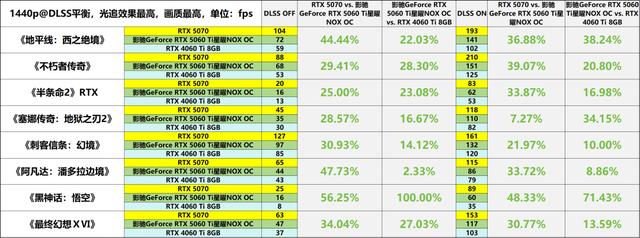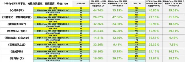 在1080p分辨率下,影驰GeForce RTX 5060 Ti星曜NOX OC在光追游戏中的表现明显优于RTX 4060 Ti。在关闭DLSS功能的情况下,其平均帧率领先幅度达到21%;而启用DLSS后,这一优势进一步扩大至24%。特别是在《黑神话:悟空》《龙腾世纪:影障守护者》等对硬件性能要求较高的游戏中,该显卡的帧率提升幅度普遍超过30%,彰显了其不俗的光追优化能力。