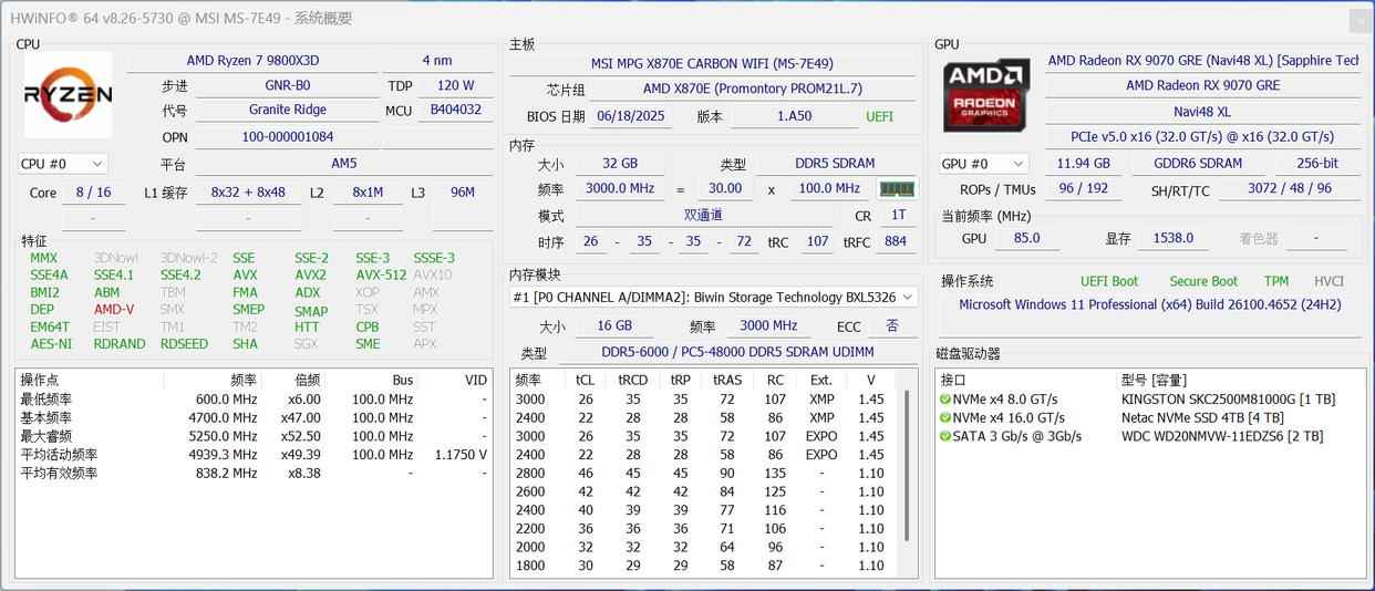 测试平台CPU是AMD锐龙7 9800X3D,开启PBO并关闭SVM功能强化分支预测性能,主板是微星MPG X870E CARBON WIFI暗黑,搭载两根DDR5 6000C26 16GB*2内存套装开启EXPO,操作系统是Windows 11 24H2最新版本,裸机26℃空调房环境。