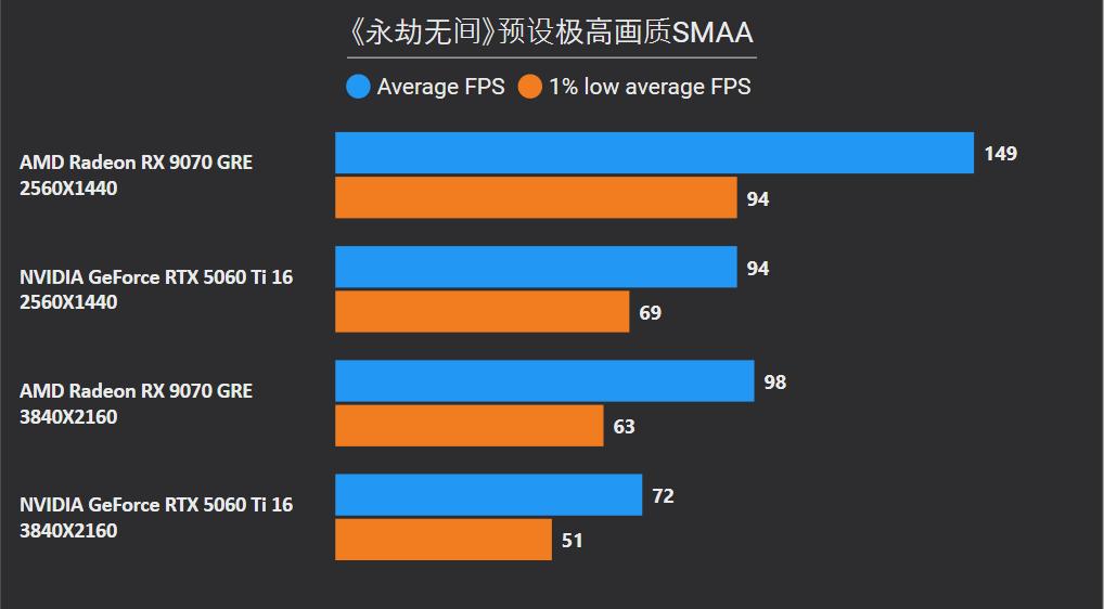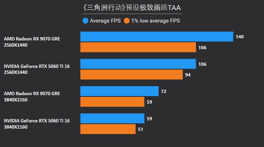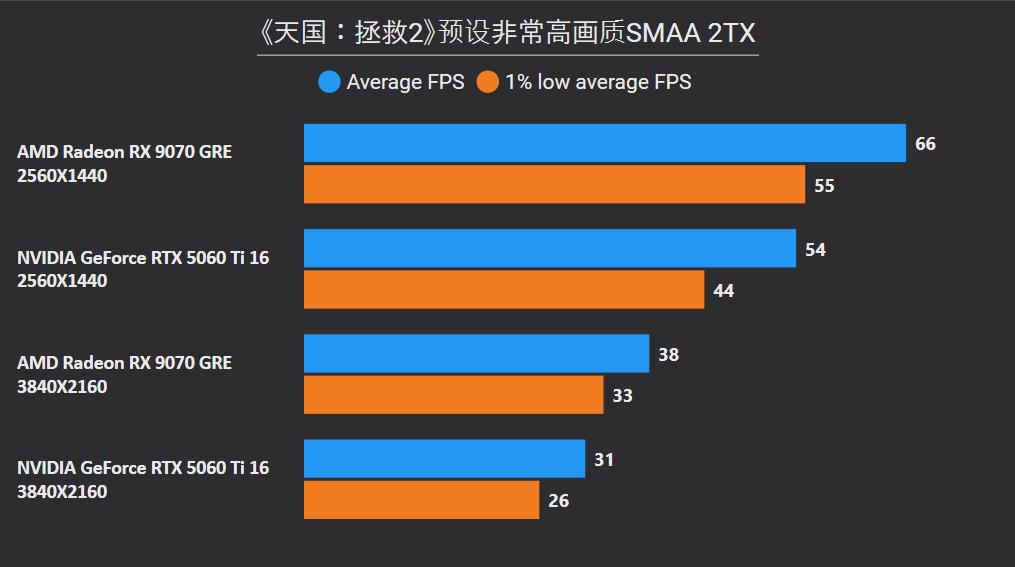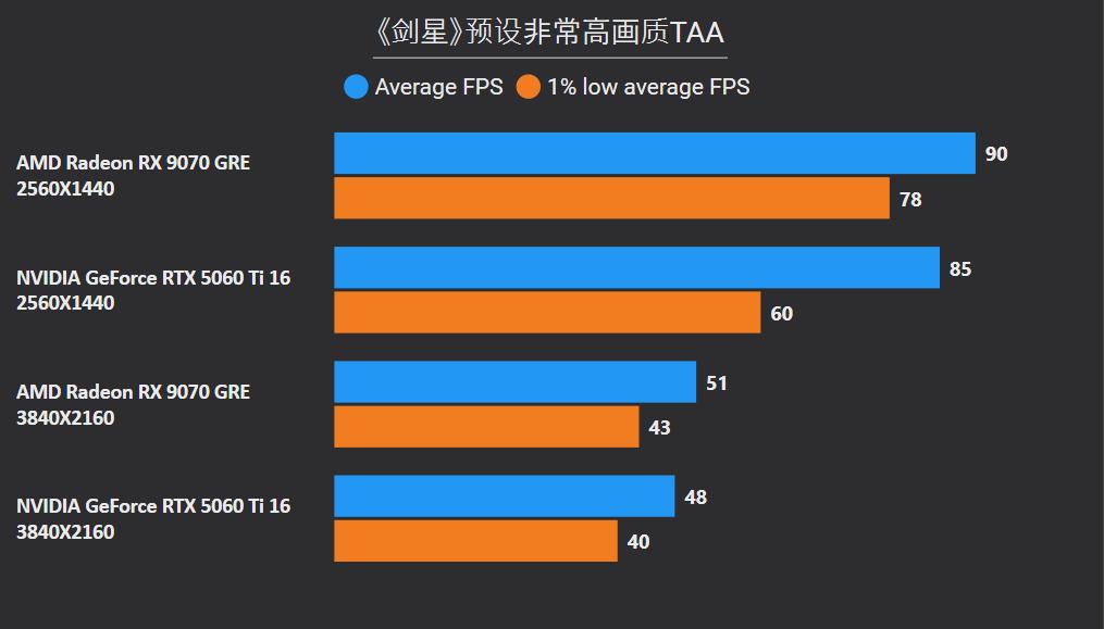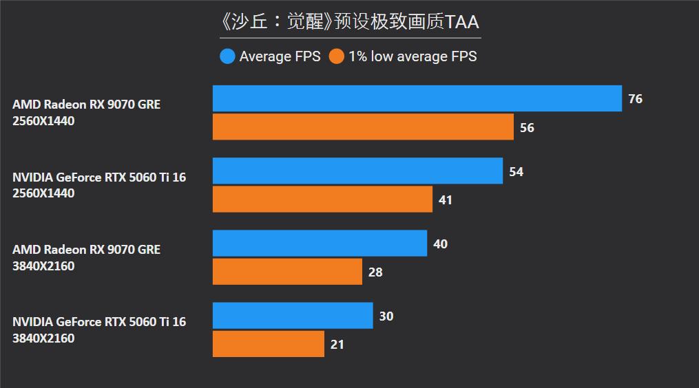 首先在这俩卡的主战场2K分辨率,RX 9070 GRE平均下来可领先26%,领先幅度最大的是《沙丘:觉醒》和《永劫无间》,分别达到41%和59%,确实是碾压般的存在,领先幅度最小是《剑星》只有6%,而《CS2》是RTX 5060 Ti唯一能制胜的项目,不过它的领先幅度只有5%。