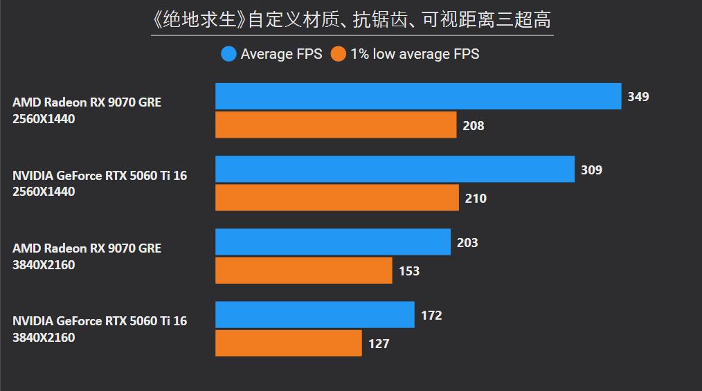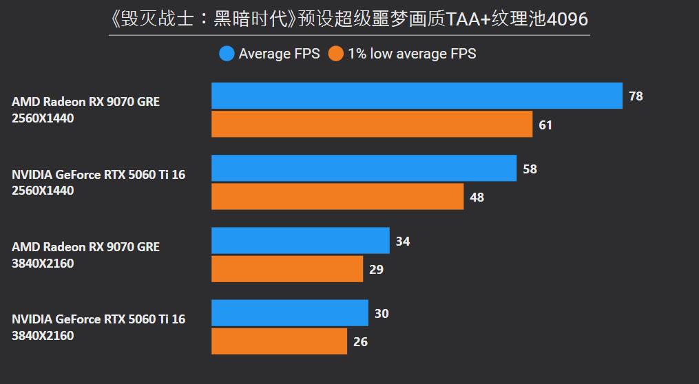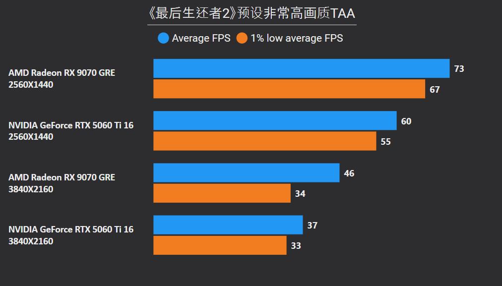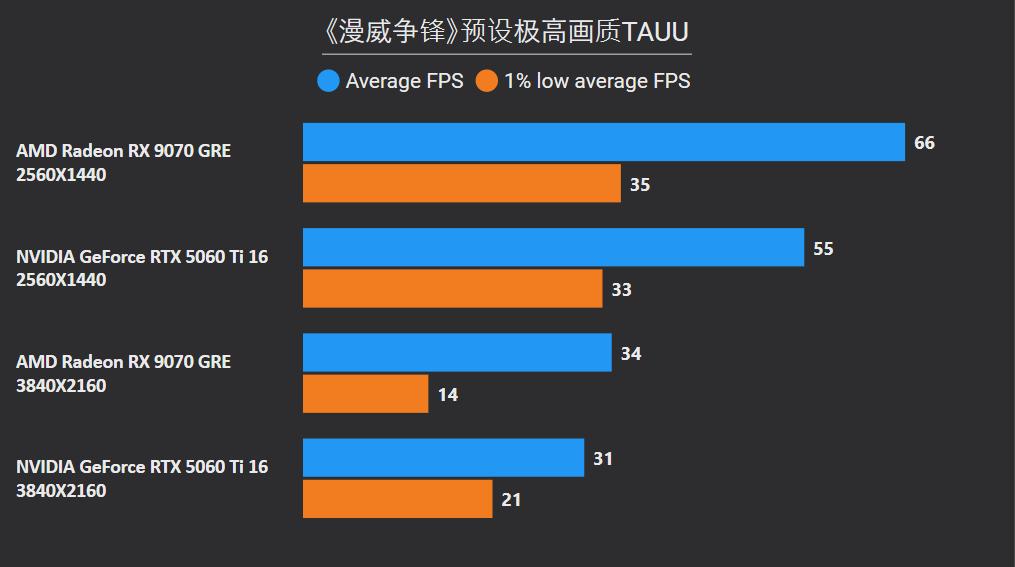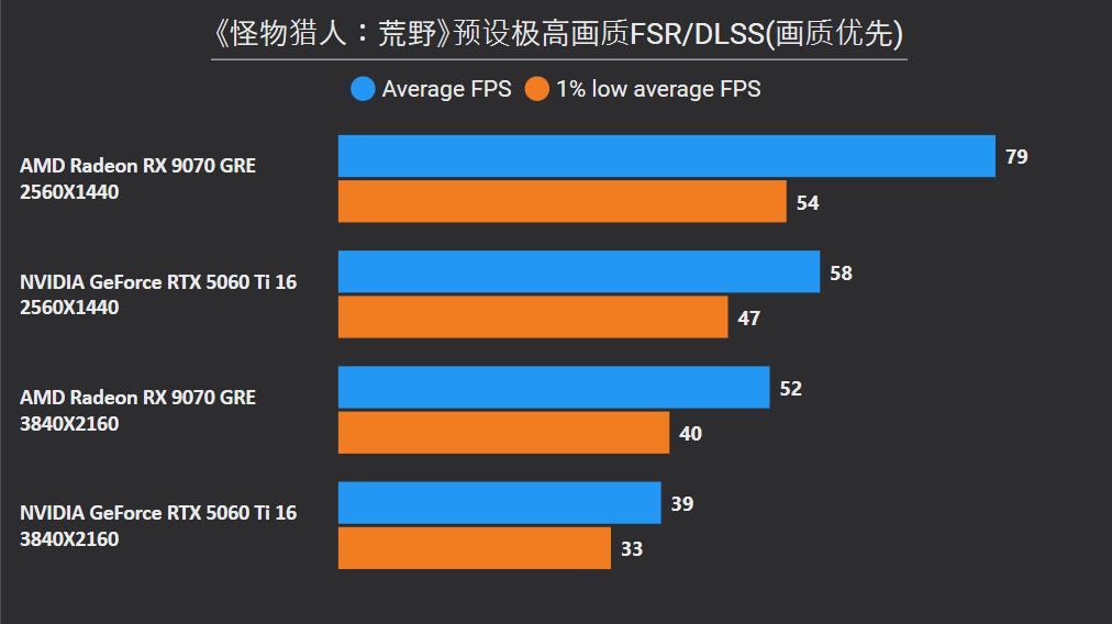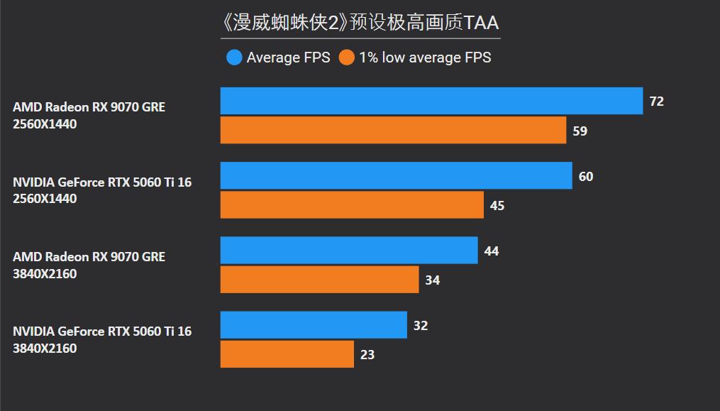 首先在这俩卡的主战场2K分辨率,RX 9070 GRE平均下来可领先26%,领先幅度最大的是《沙丘:觉醒》和《永劫无间》,分别达到41%和59%,确实是碾压般的存在,领先幅度最小是《剑星》只有6%,而《CS2》是RTX 5060 Ti唯一能制胜的项目,不过它的领先幅度只有5%。