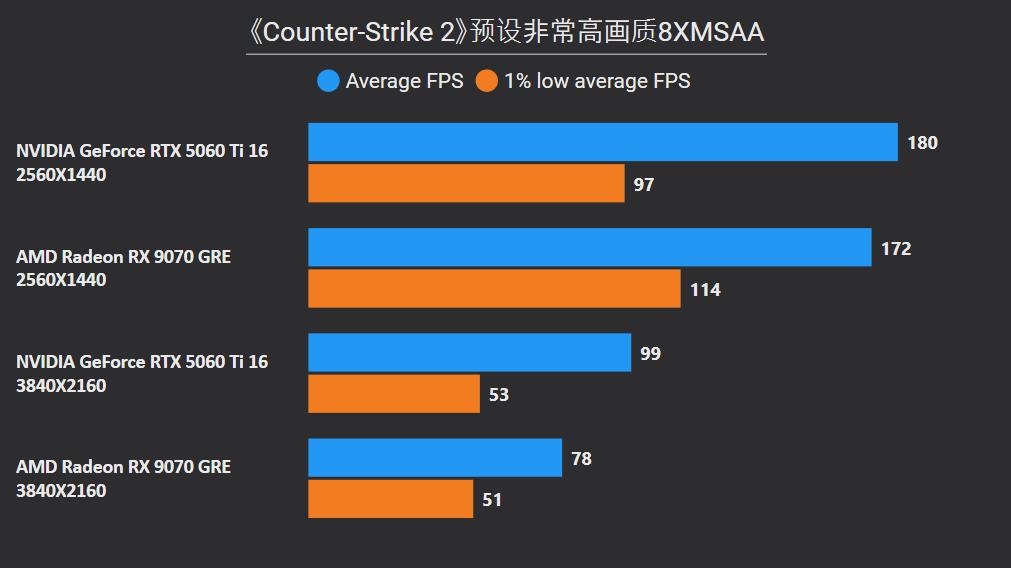 至于4K分辨率对于这俩卡都要吃力不少,RX 9070 GRE平均下来可领先20%,领先幅度最大的是《沙丘:觉醒》和《永劫无间》,都有33%和38%幅度,《剑星》依然是偏阵容不过RTX 5060 Ti还是没打过,但是留意到在《CS2》中RX 9070 GRE落后幅度扩大了不少,个人觉得可能单纯是驱动或者游戏优化缘故。