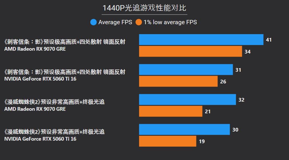 光追方面,除了上面的《毁灭战士:黑暗时代》是强制开启以外,还测试了两款可选择性,就更符合定位的2K分辨率而言,《毁灭战士:黑暗时代》和《刺客信条:影》RX 9070 GRE都可以领先30%以上,而《漫威蜘蛛侠2》由于光追强度太大,两款显卡都基本拉不开性能差距。