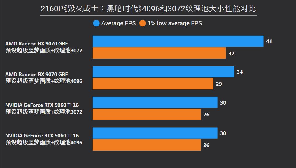 举个例子,《毁灭战士:黑暗时代》就有先进动态纹理设计,如果提示显存不足可降低纹理池大小,RX 9070 GRE在4K分辨率设置3072相比4096还可提升21%幅度,此时比RTX 5060 Ti就要强更多达到37%,影响画质很小,而RTX 5060 Ti即便有16GB显存,核心本身扛不住,调纹理池大小也就没有意义了。