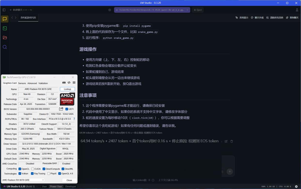 RX 9070 GRE使用Vulkan模式运行DeepSeek R1 0528 Qwen3 8B大模型(GPU卸载MAX),推理速度达到64.94 token/s