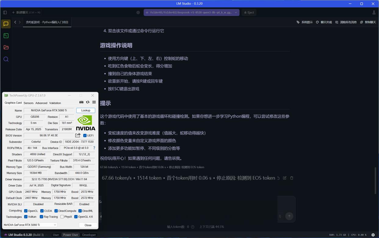 RTX 5060 Ti 16GB使用CUDA 12模式运行DeepSeek R1 0528 Qwen3 8B大模型(GPU卸载MAX),推理速度达到67.66 token/s