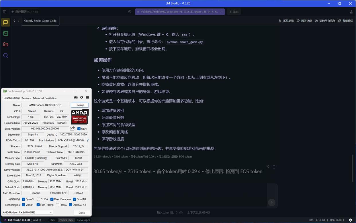 RX 9070 GRE使用Vulkan模式运行DeepSeek R1 Distill Qwen 14B大模型(GPU卸载MAX),推理速度达到38.65 token/s