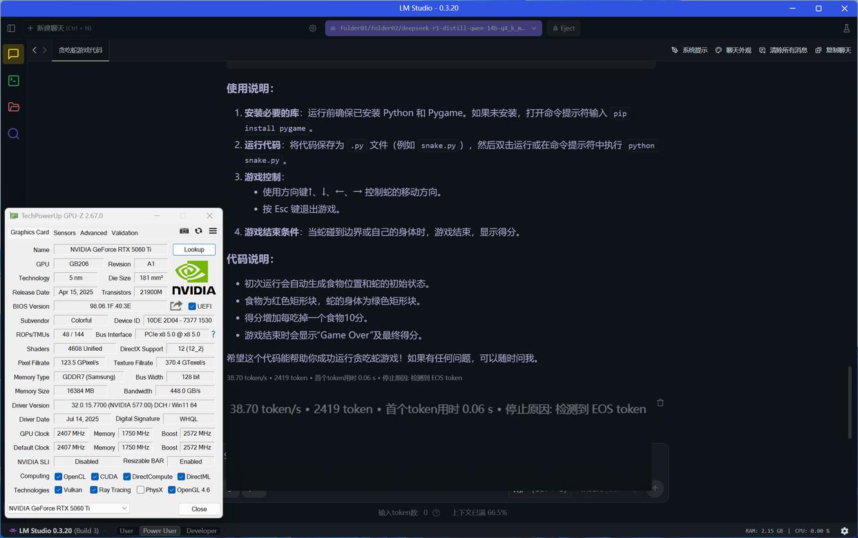 RTX 5060 Ti 16GB使用CUDA 12模式运行DeepSeek R1 Distill Qwen 14B大模型(GPU卸载MAX),推理速度达到38.70 token/s