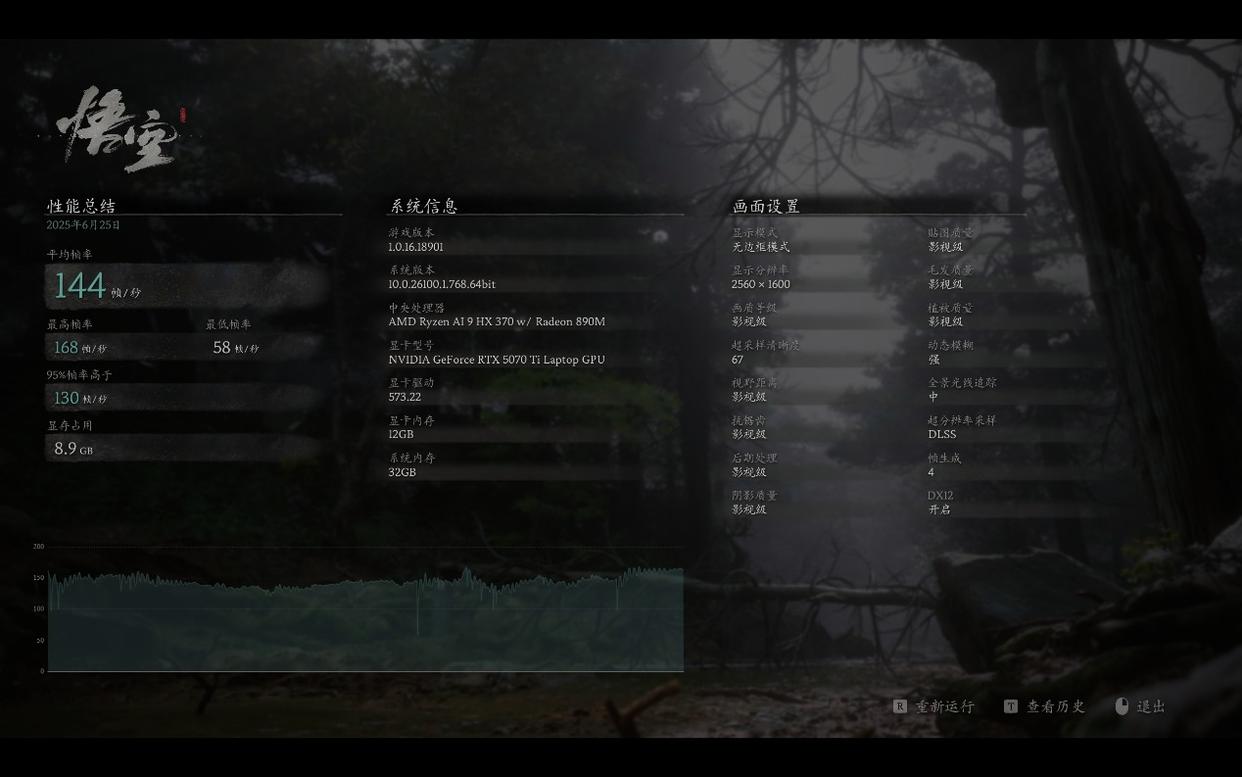 《黑神话:悟空》测试中,2.5K电影级画质与DLSS 4的组合带来了惊人的视觉震撼。开启DLSS4后,画面平均帧率从47帧提升至144帧,角色的每一个动作丝毫毕现。