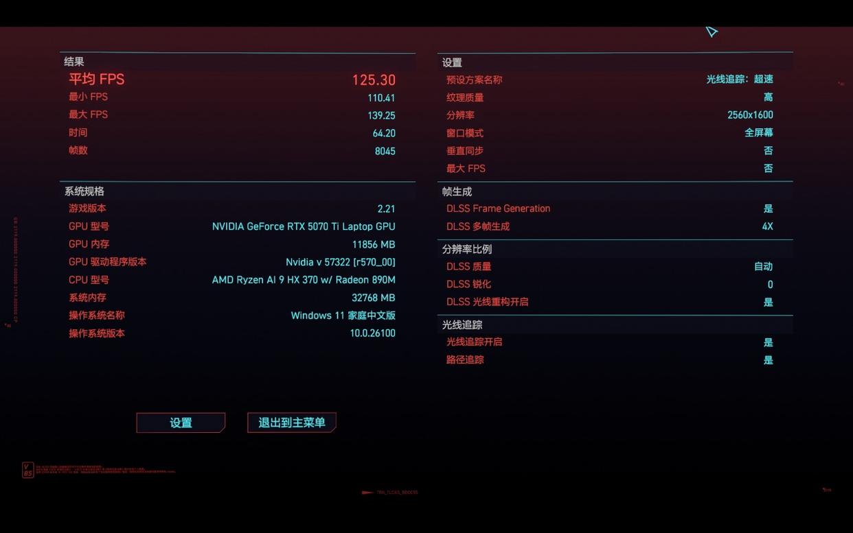 《赛博朋克2077》中,我将画质设为2.5K分辨率并开启全速光线追踪。当关闭DLSS 4帧生成时,平均帧率维持在40帧左右;而开启帧生成后,平均帧率直接飙升至125帧。此时的夜之城,霓虹灯在湿滑路面倒映出长长的光轨,雨滴击打车窗的水痕清晰可见,画面美得让人想截图当壁纸。