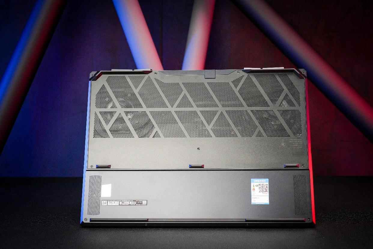 散热方面,绝影18 锐龙版采用了真空腔均热板与Cooler Boost散热技术。仅从机身D面的大面积的散热格栅,以及内部硕大的双风扇和遍布机身的热管便可以窥探其强大的散热能力。
