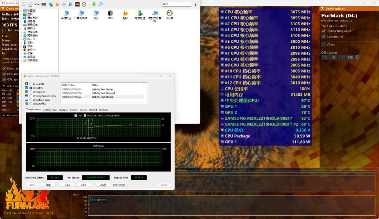 在长时间双烤测试中,CPU和GPU的核心温度、频率和功耗都能维持在理想范围,整机功耗释放达到170w+。