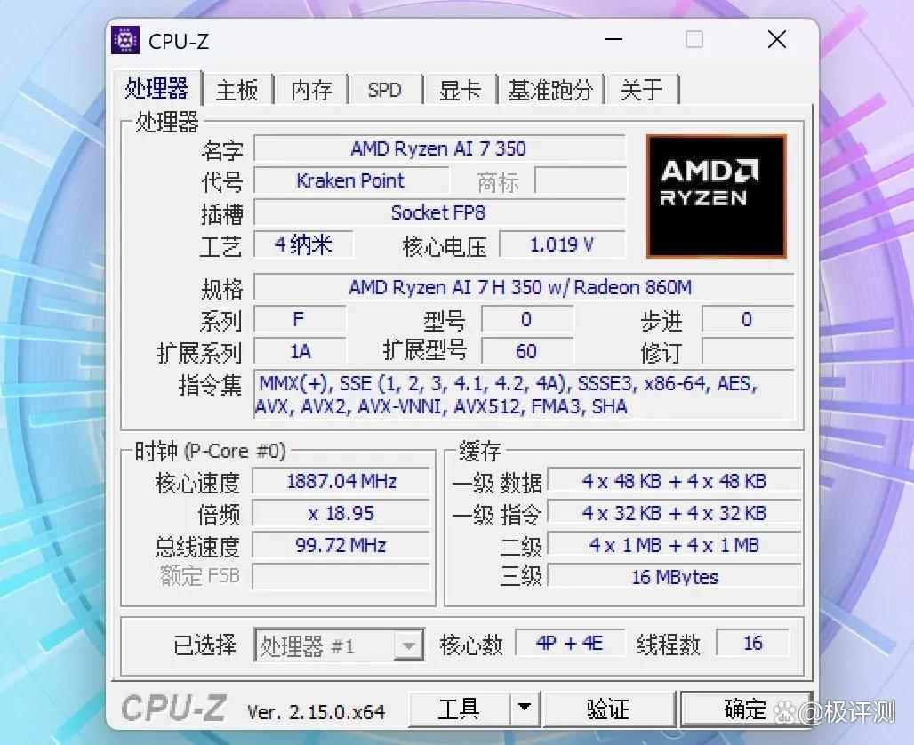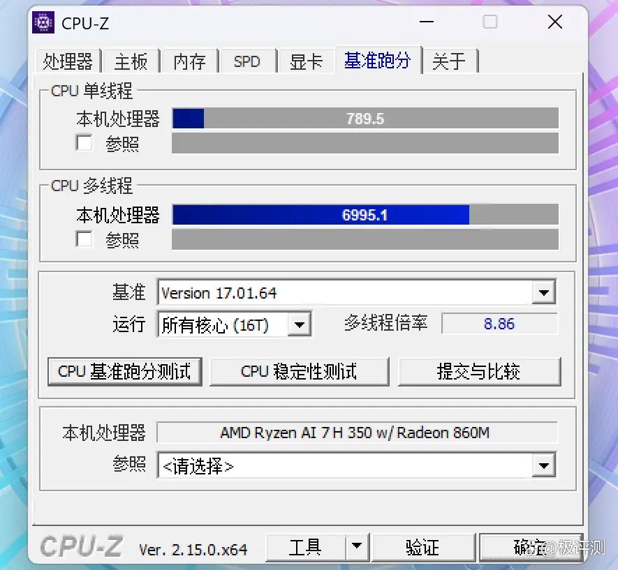 AMD锐龙AI 7 H 350处理器算是目前主流AI PC平台比较常用的处理器,因为采用了单CCX设计,所以核间延迟比较低。在CPU-Z 2.15基准性能测试中,其单线程得分为789.5,多线程得分为6995.1。