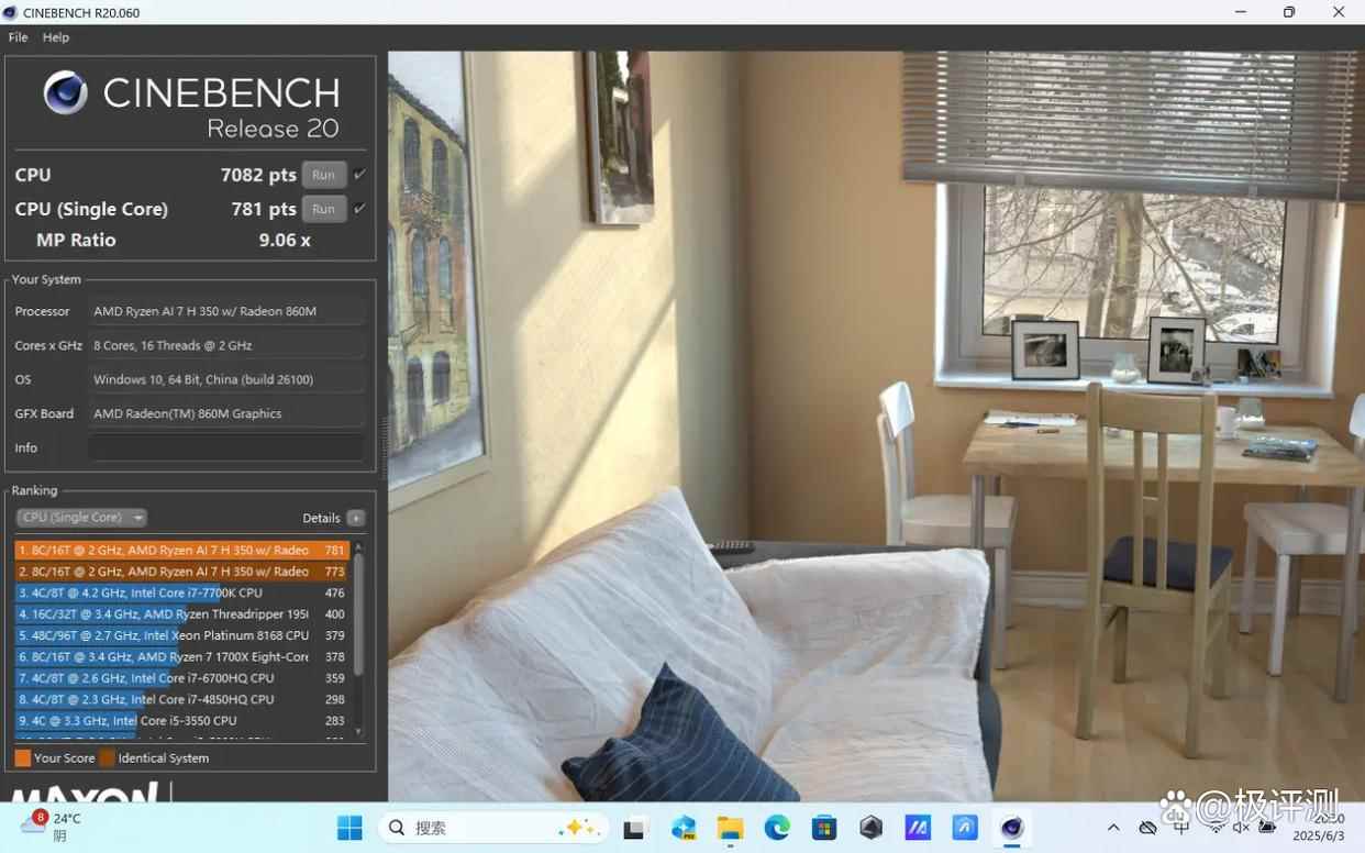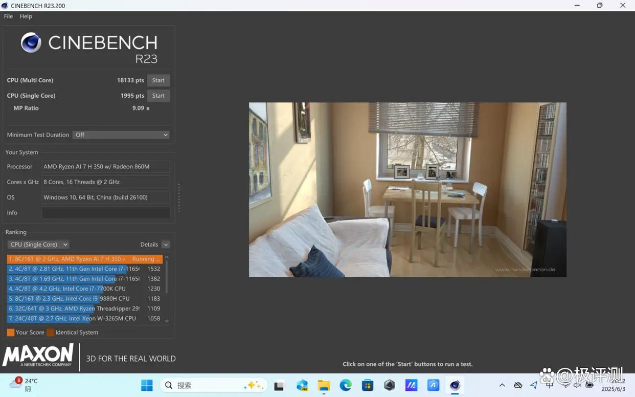 CineBench R20和CineBench R23主要测试CPU的图形渲染能力。天选Air 2025采用的锐龙AI 7 H 350处理器符合预期,在R20项目中单核成绩为781pts,多核成绩为7082pts;在R23项目中单核成绩为1995pts,多核成绩为18133pts。
