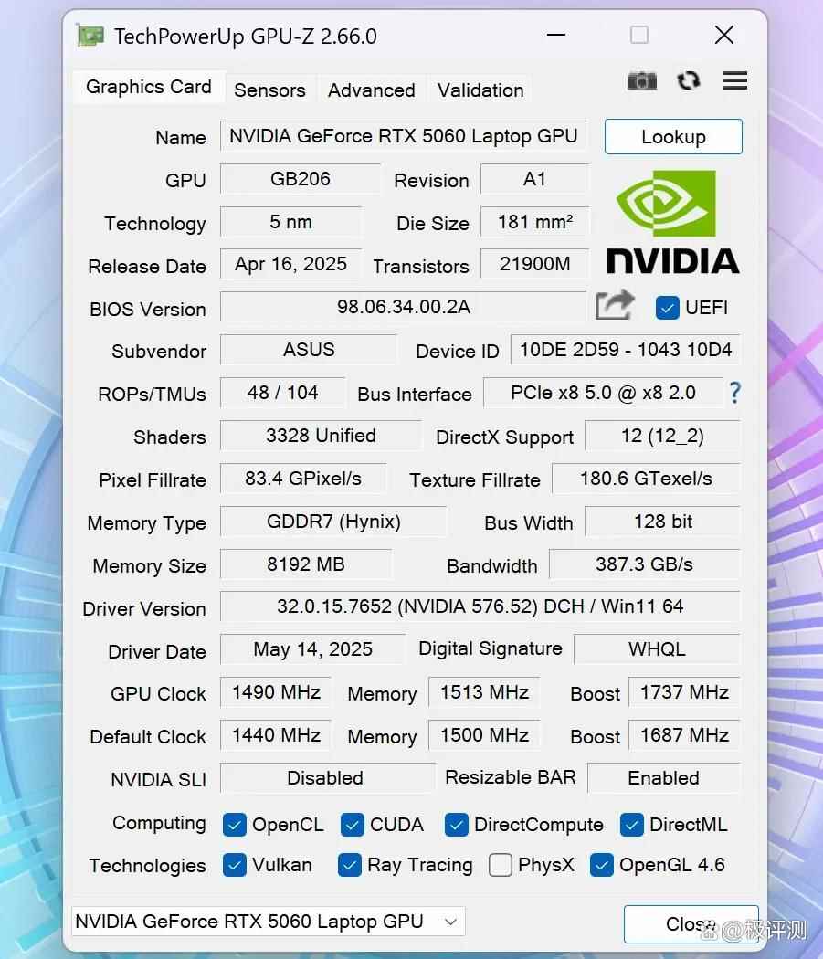 天选Air 2025的显卡升级到了最新的RTX 5060笔记本电脑GPU,基于全新的Blackwell架构,拥有3328个CUDA核心,8GB GDDR7显存,支持110W性能释放,性能相比上一代RTX 4060提升明显。