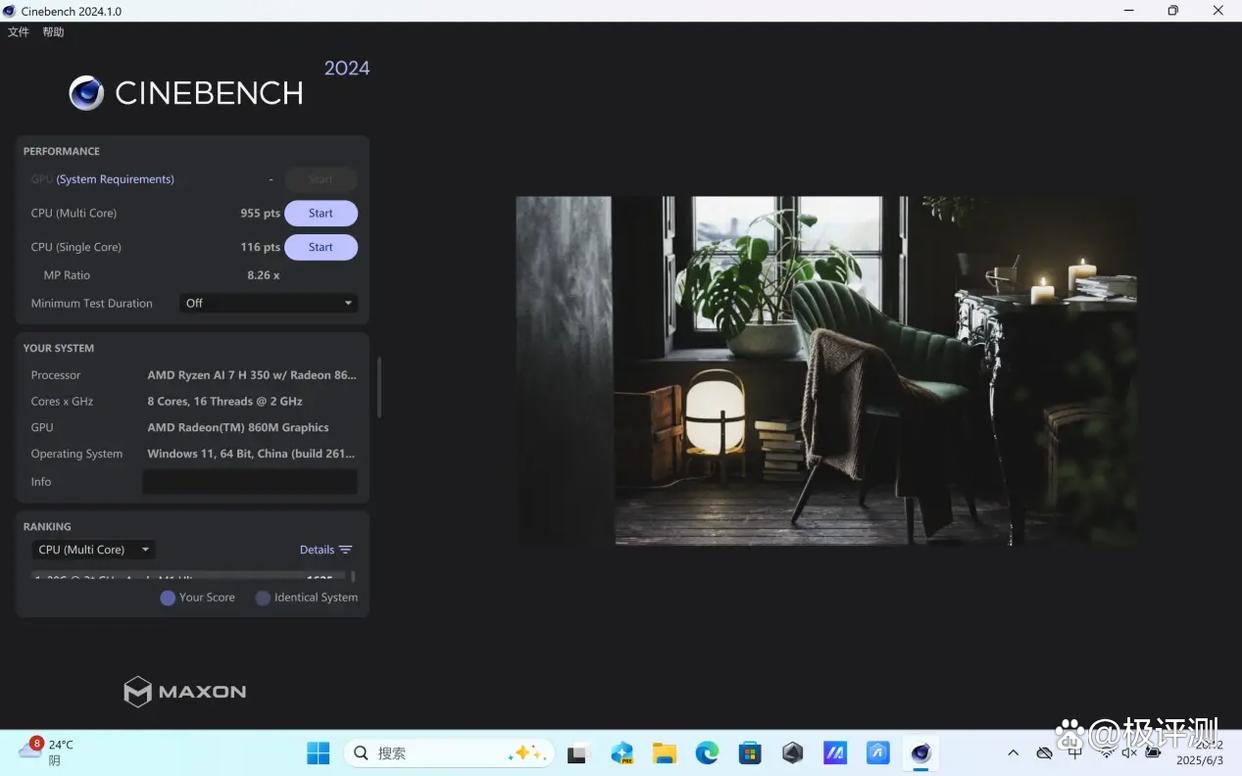 CineBench 2024的测试负载更重,更考验CPU的综合性能。天选Air 2025的CPU单核性能为116pts,多核性能为955pts。