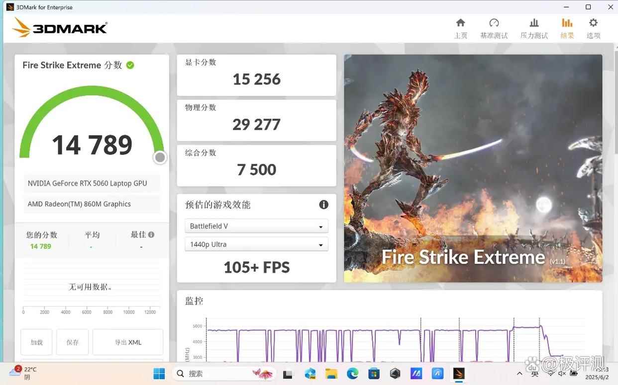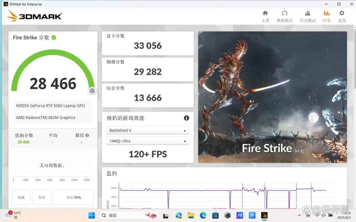 在体现DirectX 11游戏性能的3DMark Fire Strike Ultra、Fire Strike Extreme和Fire Strike项目测试中,天选Air 2025的成绩相比上一代也有大幅提升,分别达到了7465(显卡得分7223)、14789(显卡得分15256)和28466(显卡得分33056),可以流畅运行绝大多数3A游戏。