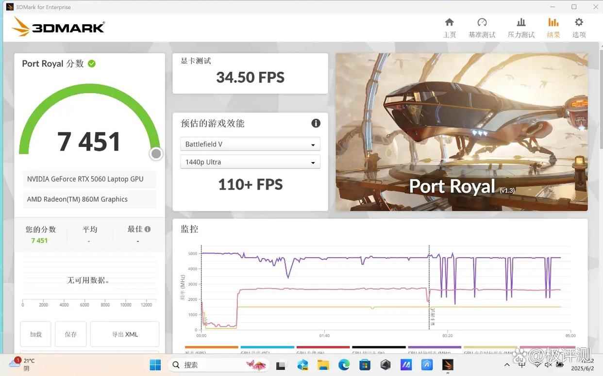 在3DMark Port Royal项目中,天选Air 2025得分为7451,显卡测试帧率为34.50FPS,理论光追性能提升了23.4%,即便不启用帧生成技术也可以应对大型光追游戏流畅运行。
