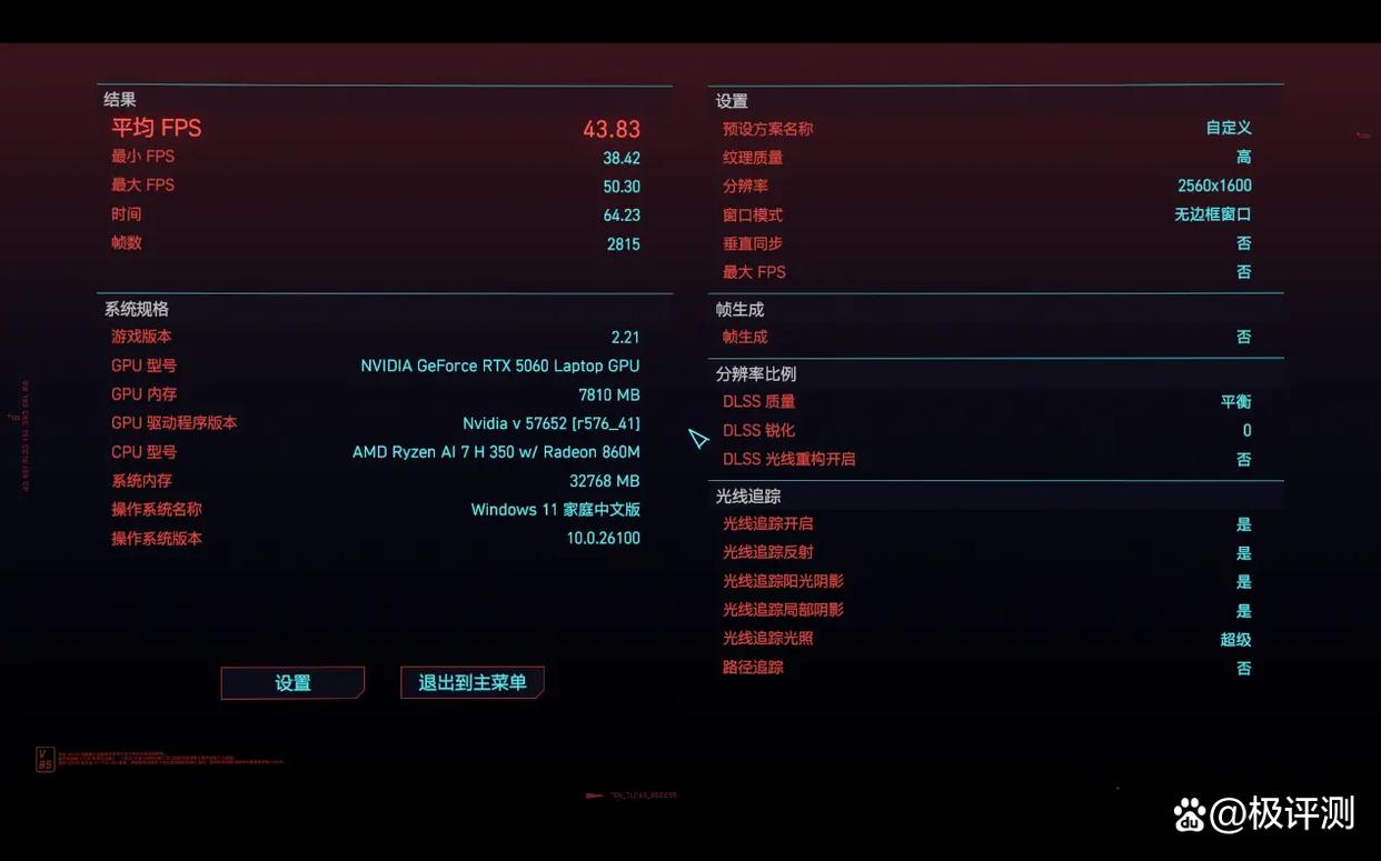 在《赛博朋克2077》中,在2560×1600分辨率、光线追踪:超级模式、启用DLSS平衡模式的情况下,关闭帧生成游戏帧率为43.83FPS,开启4X帧生成后游戏帧率达到了108.60FPS,游戏性能提升幅度也达到了148%。