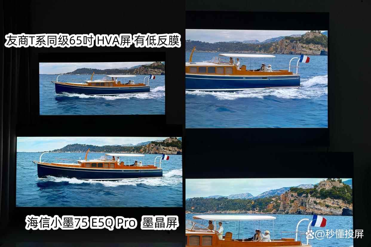 这个部分令我意外,如下图下方为小墨E5Q Pro,上方电视则为友商同级产品。面对风景图时双方最大的差异就是景深感。上方友商多了一层白雾笼罩感。下方E5则像擦干净后的玻璃,更为通透。比如右上角的山体清晰度和色彩都有差异。