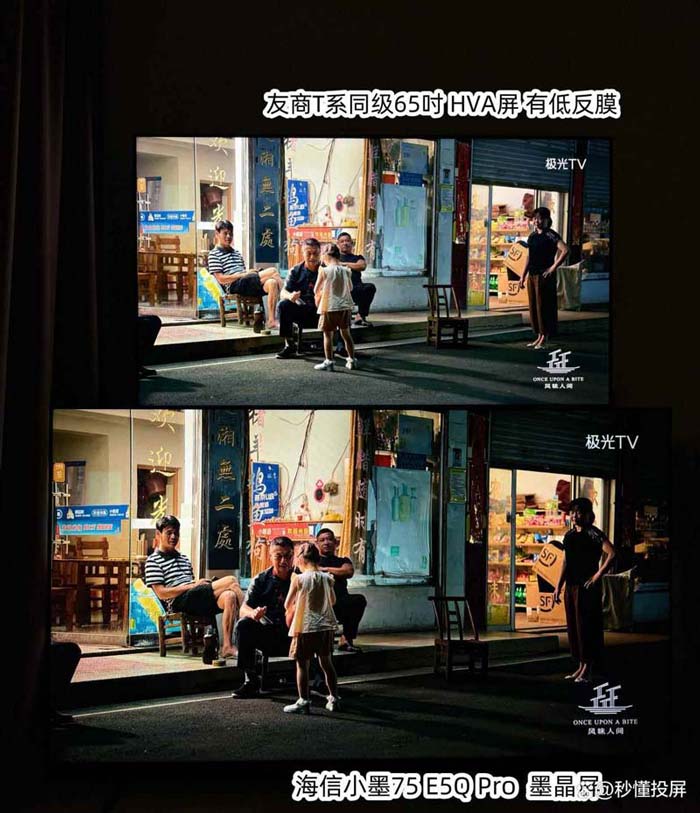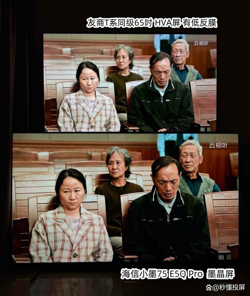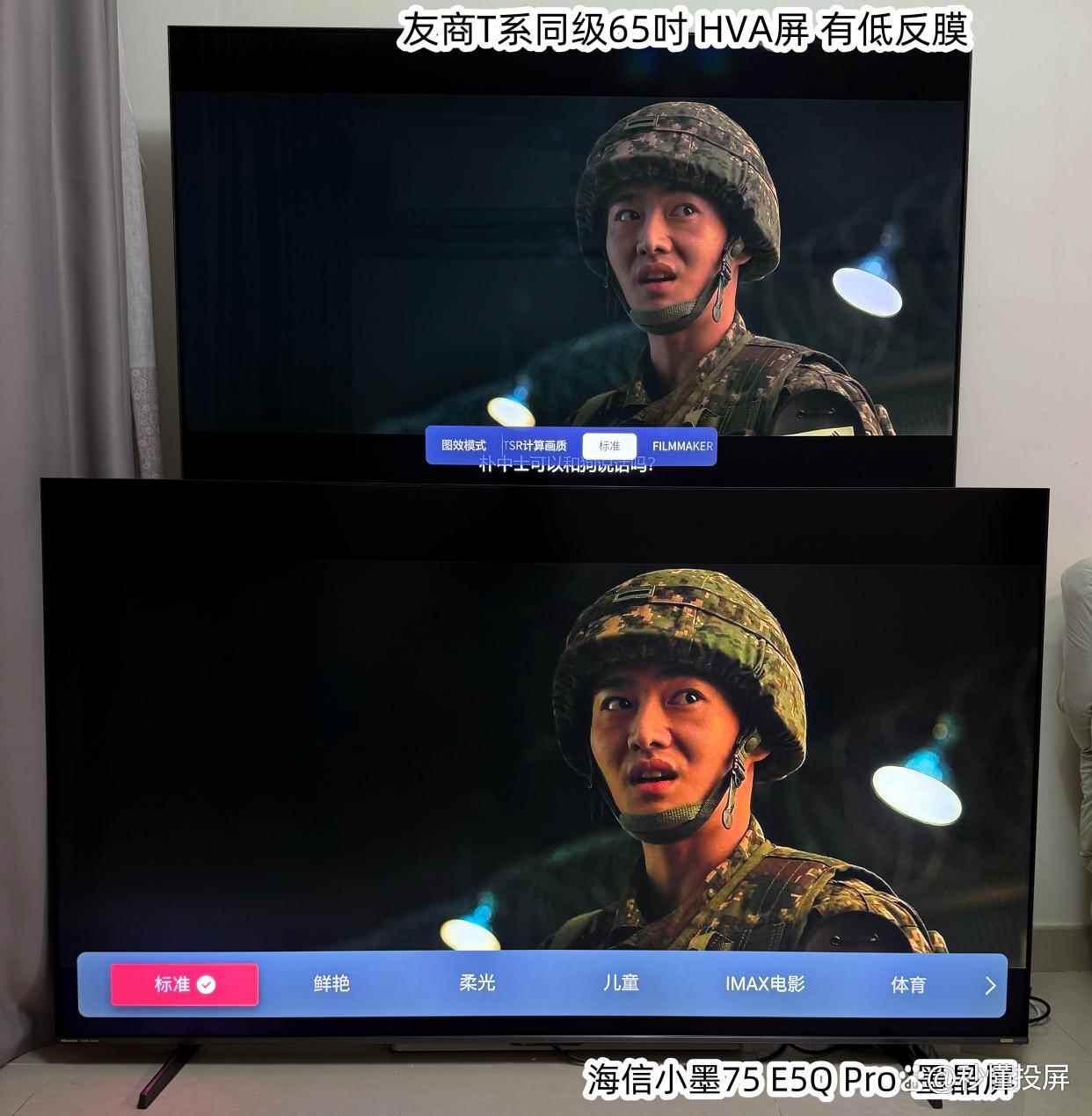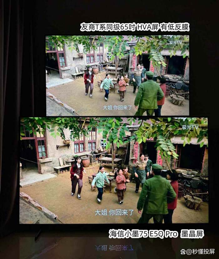 两者都为标准模式,图1 下方墨晶屏的优势画面黑底会更干净,士兵衣服脸色颜色更深和有血色。灯光照在身上光照感强。(对比图中上为友商同级65寸,下为海信小墨E5Q Pro 75吋,下同)。