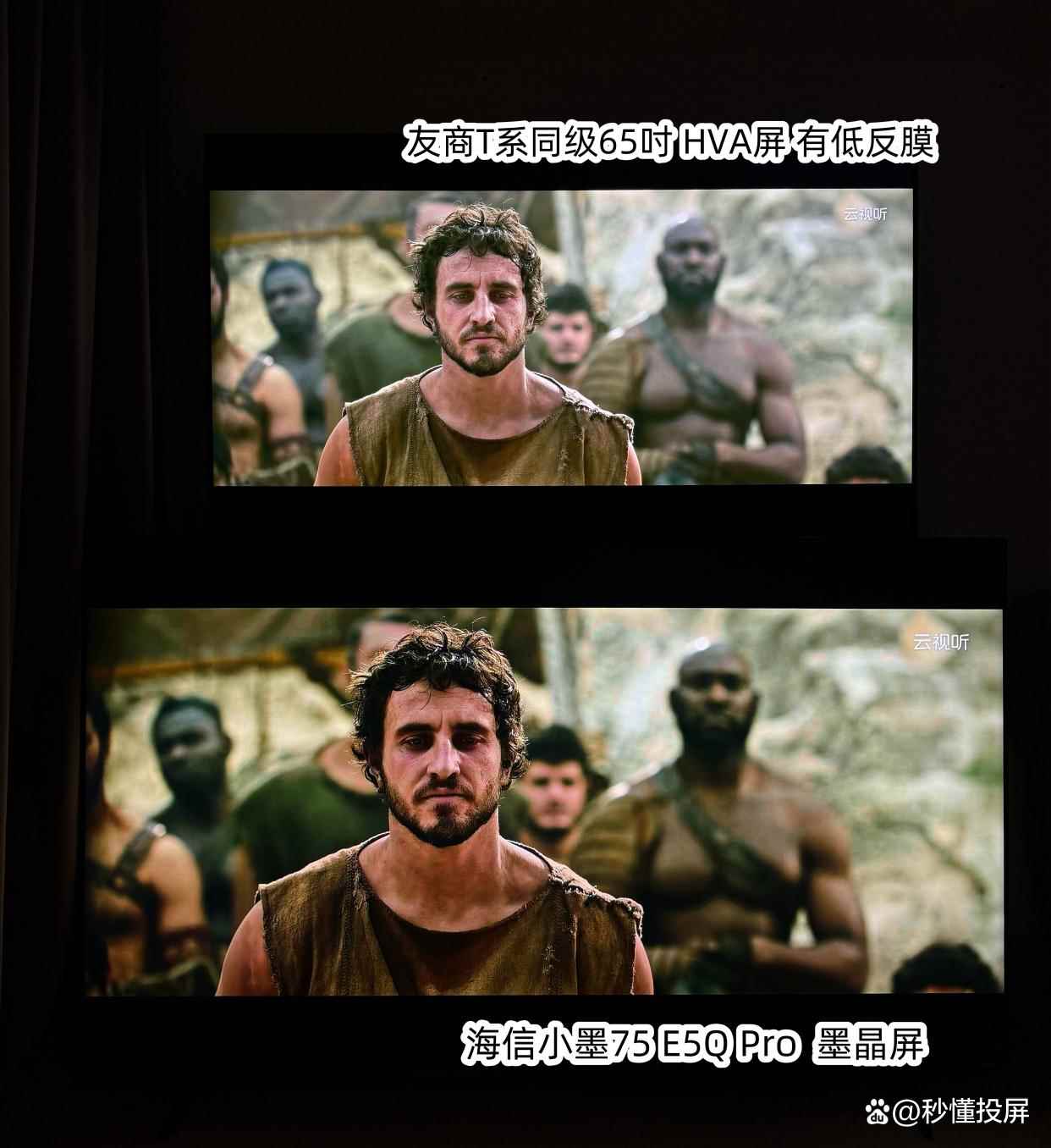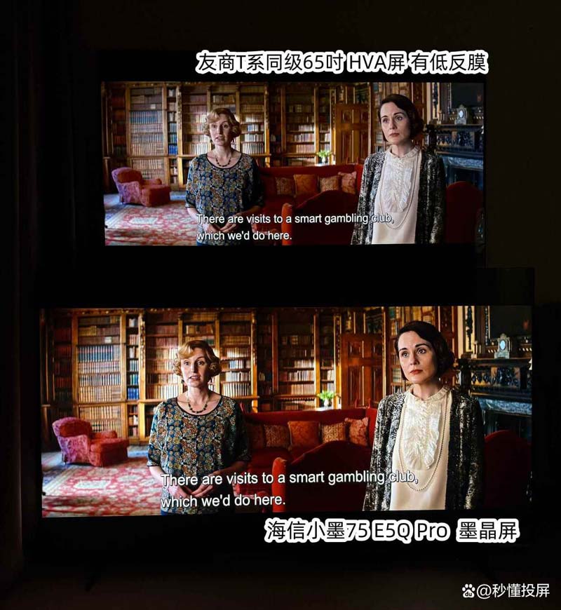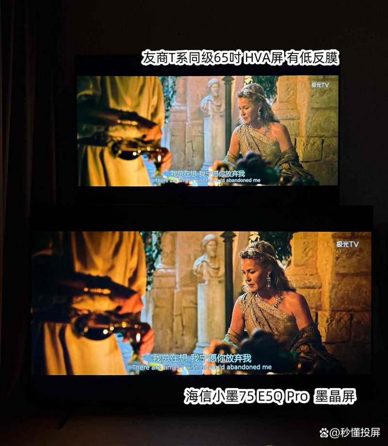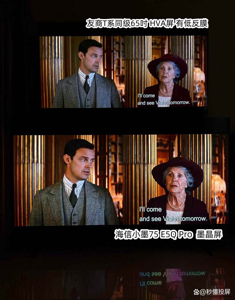 两者都为标准模式,图1 下方墨晶屏的优势画面黑底会更干净,士兵衣服脸色颜色更深和有血色。灯光照在身上光照感强。(对比图中上为友商同级65寸,下为海信小墨E5Q Pro 75吋,下同)。