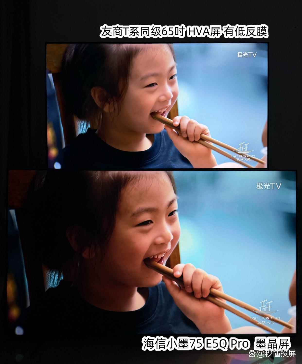 在电视剧纪录片中,友商的写实感会变得苍白一点,小女孩脸部整体偏白。海信小墨E5Q则为光影层次更多。