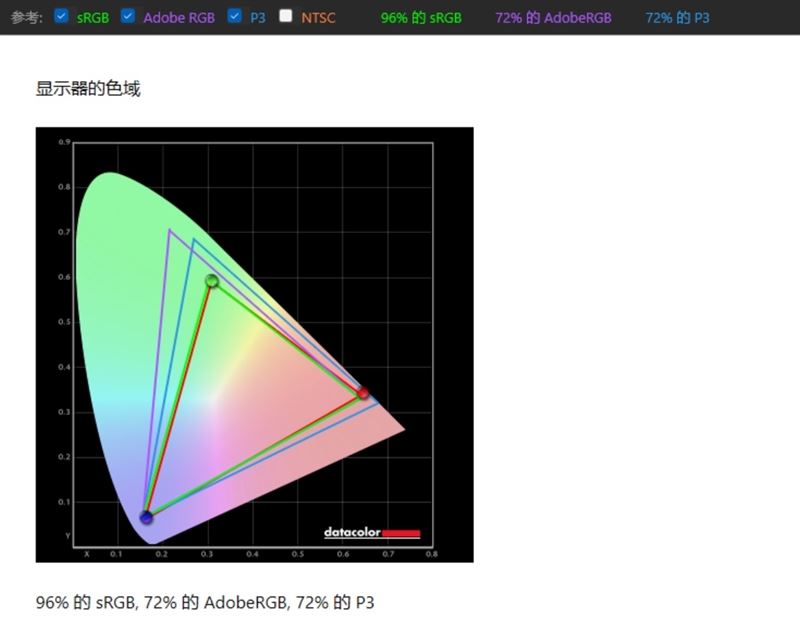 实测96%的sRGB色域、72%的aRGB色域、72%的DCI-P3色域以及 66%的NTSC色域覆盖)。