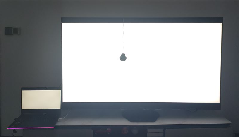 左边是某品牌3万元的顶级游戏本,屏幕亮度为500nits。2台显示设备都开了最高亮度之后,差别非常明显,这即是500nits与900nits之间的差异。