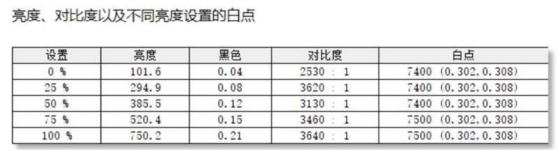实测SDR模式下,最高亮度750nits,对比度约为3500:1,白点色温7500,稍微偏冷。