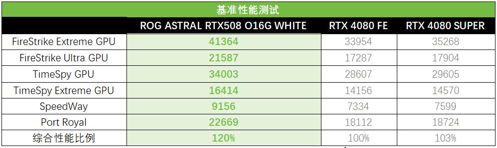 3DMark GPU基准性能测试部分,可以看到相比RTX 4080,ROG ASTRAL白夜神RTX 5080在DX11的FireStrike测试中,平均领先RTX 4080 23%,在DX12的TimeSpy系列中则提升17%,而在SpeedWay和Port Royal中则提升了25%。ROG ASTRAL白夜神RTX 5080相比RTX 4080 SUPER的提升也是比较明显的,其中FireStrike测试中领先19%、TimeSpy中领先14%、SpeedWay和Port Royal中提升了21%。综合来看,ROG ASTRAL白夜神RTX 5080比RTX 4080提升了22%,相对RTX 4080 SUPER平均提升了18%。