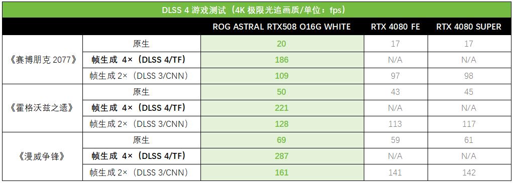 综合DLSS 4游戏测试的成绩来看,ROG ASTRAL白夜神RTX 5080 配合DLSS 4的确能够带来巨大的性能飞跃。测试三款游戏在DLSS 4的加持下,其帧率都可以达到原生分辨率的4倍以上,《赛博朋克2077》更是达到原生分辨率的9.3倍,堪称“黑科技”级别的提升。