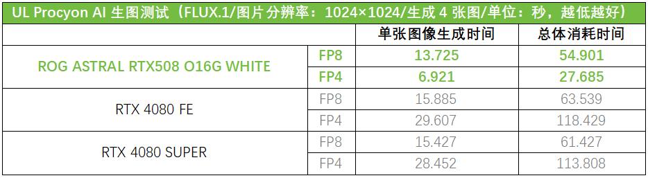 AI性能方面,从测试可以看到,ROG ASTRAL白夜神RTX 5080在FP4模式下相对FP8模式出图速度大约快了一倍,而RTX 4080和RTX 4080 SUPER由于不支持FP4模式,在FP4模式下的出图效率几乎相比FP8模式慢了一半,更是只有ROG ASTRAL白夜神RTX 5080在FP4模式下的23%~24%。有AI应用和AIGC创作需求的用户,使用ROG ASTRAL白夜神RTX 5080能够带来更高的效率提升。
