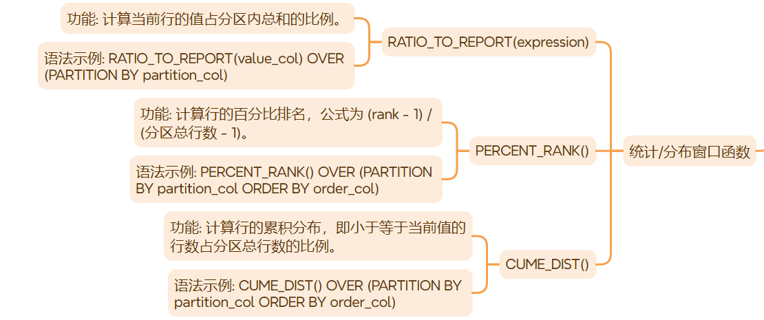 - 功能:计算行的累积分布,即小于等于当前值的行数占分区总行数的比例。