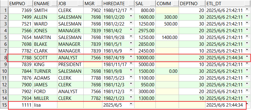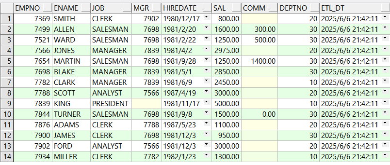 drop TABLE emp_tar; CREATE TABLE emp_tar AS SELECT e.*, SYSDATE etl_dt FROM emp e WHERE 1 = 2; select * from emp_tar;