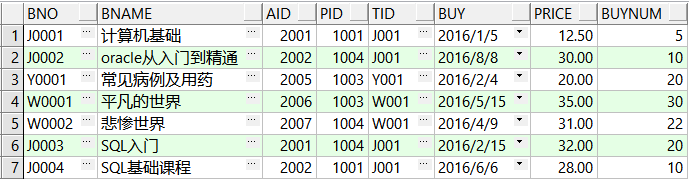 insert into book values('J0003','SQL入门',2001,1004,'J001',date '2016-2-15',32,20);