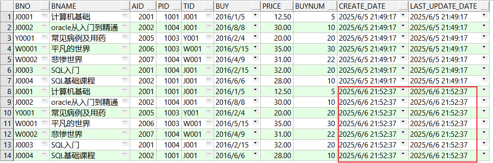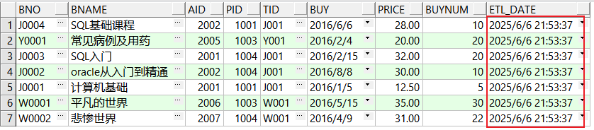 -- 没有匹配到数据,是新增数据 begin p_BOOK_SOURCE_TARGET(P_DT => trunc(SYSDATE) - 1); -- 传入昨天的日期 end; SELECT * FROM BOOK_TARGET;