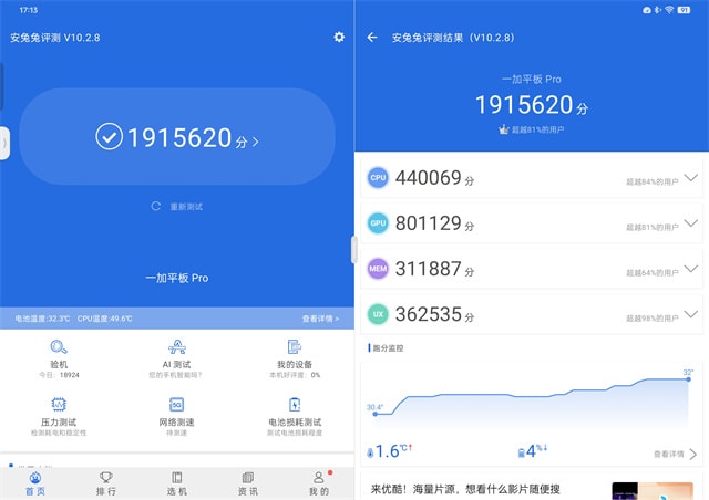 要说一加平板Pro最让人印象深刻的就是其搭载了高通第三代骁龙8移动平台,这也是当下安卓性能的天花板,能够轻松应对大型游戏,我们实测在正常的夏季室温环境下,安兔兔V10跑分成绩可达191万以上,如果环境温度可以降低一些的话,跑分应该还可以更高。