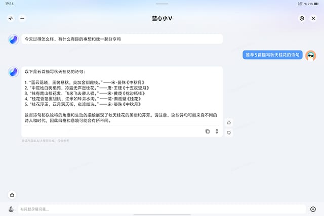在文案创作和工作编排方面,蓝心小V能帮你写周报、写思维导图、些朋友圈文案等等,这些对于上班族和学生党使用较为频繁的日常任务,小V都可以替你更高效的完成。