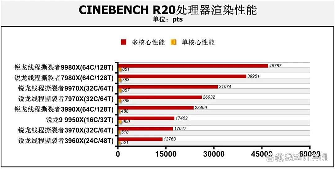 在CINEBENCH R20处理器渲染性能测试中也有类似结果,在该测试中我们能找到第三代锐龙线程撕裂者3000系列处理器的成绩与它们对比。其在单核心性能上的区别同样十分明显,第三代产品的单核心性能在488~521分之间,到了锐龙线程撕裂者7980X、锐龙线程撕裂者7970X,它们的单核心性能就提升到780分这个级别。而最新的锐龙线程撕裂者9980X、锐龙线程撕裂者9970X的单核心性能更进一步,达到850分级,锐龙9 9950X则凭借核心数量更少,加速频率更高,其单核心性能达到900分。因此锐龙线程撕裂者9980X、锐龙线程撕裂者9970X的多核心性能都获得了大幅提升,较锐龙线程撕裂者7980X、锐龙线程撕裂者7970X分别获得17%、19%的显著进步。同时,锐龙9 9950X也只用16颗核心就击败了32核心的锐龙线程撕裂者3970X。