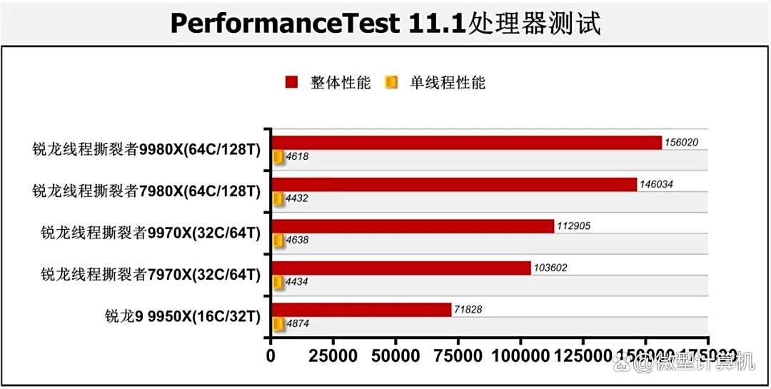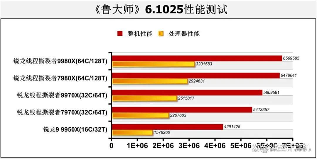 在对处理器单线程、多线程性能进行综合评估的《鲁大师》处理器测试中,五款参测处理器也有明显的区别——锐龙线程撕裂者9980X是唯一一款处理器性能得分达到320万以上的产品,核心数量少一半的锐龙线程撕裂者9970X则能获得251万的得分,比同为32核心的锐龙线程撕裂者7970X领先了13.96%。核心数只有16颗的锐龙9 9950X则只有157万分的成绩。综合以上测试,不难看出尽管锐龙线程撕裂者9980X、锐龙线程撕裂者9970X与锐龙线程撕裂者7980X、锐龙线程撕裂者7970X在技术层面上只相差一代,但它们的单核心、多核心性能都有明显进步。