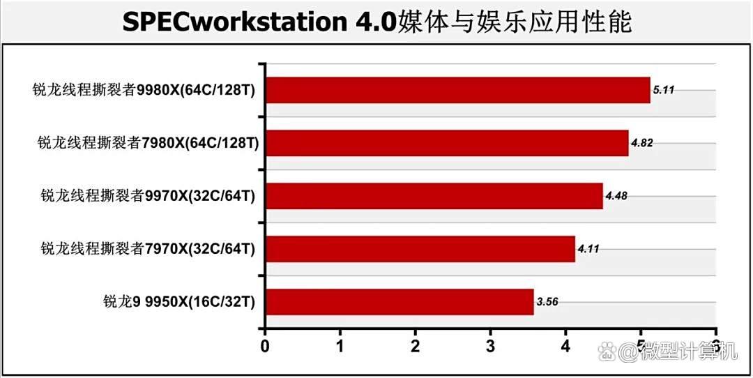 接下来就让我们通过实际应用测试来看看更强的处理器性能是否能在各类专业应用、软件中带来好处。因为锐龙线程撕裂者是为工作站打造的处理器,所以我们首先就使用SPECworkstation 4.0测试了各个测试平台在AI与机器学习、能源领域、金融服务、生命科学应用、媒体与娱乐行业与产品设计的性能表现。而锐龙线程撕裂者9980X在能源领域、金融服务、生命科学应用三个测试中能与其他处理器拉开非常显著的差距。比如在能源领域测试中,锐龙线程撕裂者9980X相对上一代的锐龙线程撕裂者7980X领先19%,相对同代但核心数少一半的锐龙线程撕裂者9970X也有46.3%的优势。这是因为能源领域测试中包括将卷积滤波器应用于图像的性能测试,用于模拟静电、热传导和流体流动的二维泊松方程求解,以及处理地震成像数据的地表相关多重预测性能测试(SRMP),而这些测试都能调动远超64条CPU线程参与运算。