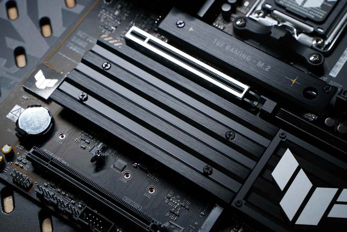 主板共提供四个 M.2 插槽,扩展灵活。最上方靠近 CPU 的为 PCIe 5.0 x4 接口,支持直连处理器,并配有独立散热片。第二和三M.2分别是PCIe 5.0 x4 和 PCIe 4.0 x4 接口,用的是一体式金属散热片。最下方为 PCIe 4.0 x4 接口,这速度配置组合满足绝大多数人的使用需求。