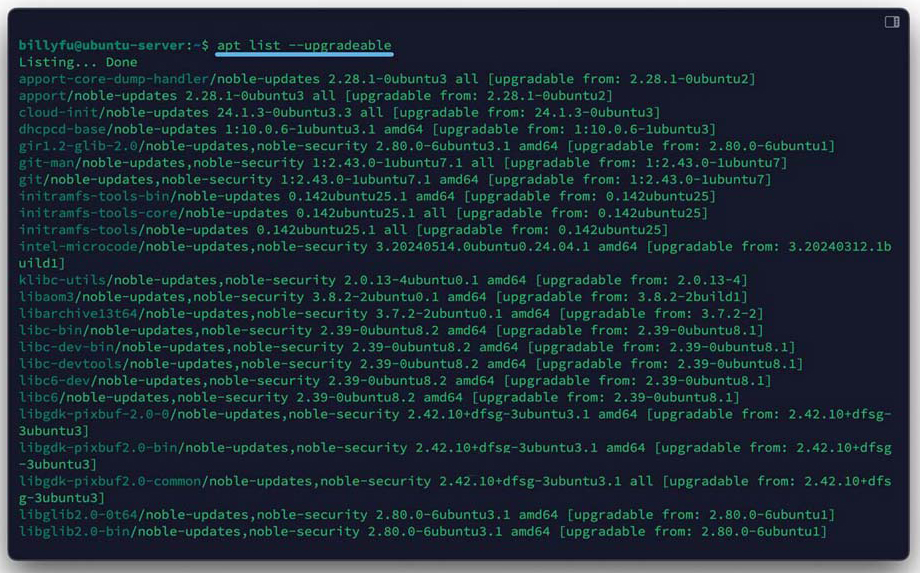 在执行apt update之后,使用此命令会列出所有可升级的软件包,方便你知道有哪些新版本的软件可以升级。