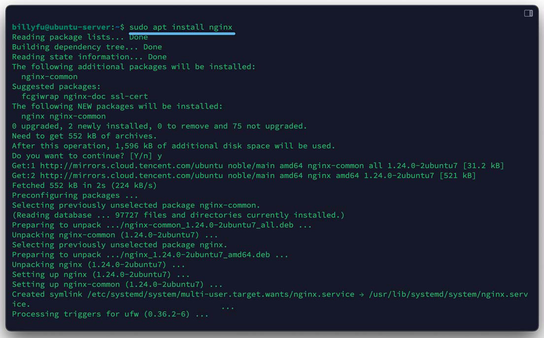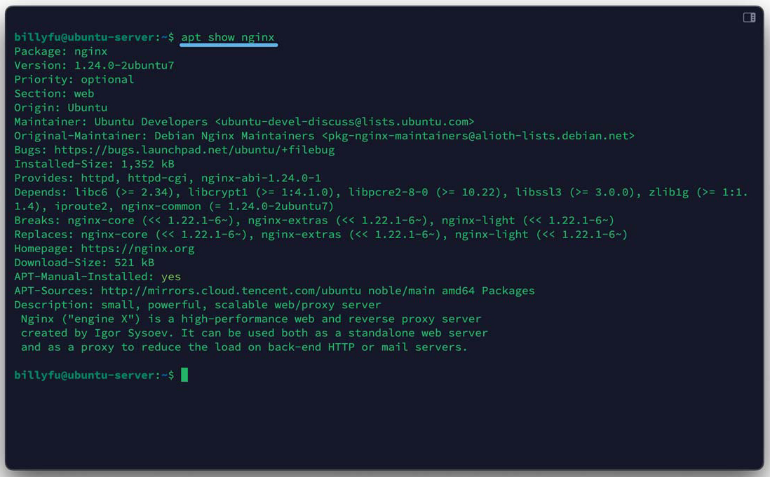 安装新软件包是 APT 最常用的功能之一。在更新软件包数据库后,使用apt install命令即可轻松安装所需软件。比如,要安装 Nginx Web 服务器,运行以下命令: