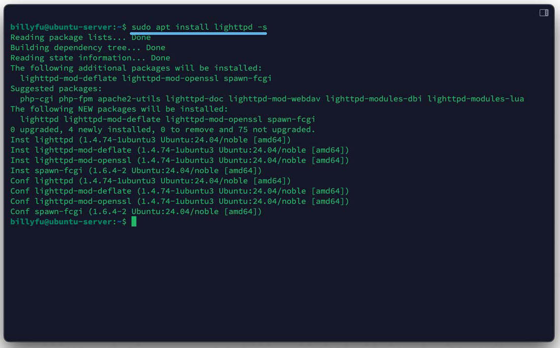 在正式安装软件包之前,你可以使用-s参数来模拟安装过程,这相当于进行一次安装过程预演apt会展示所有要执行的操作,但不会实际安装软件包。例如,模拟安装 lighttpd 软件包: