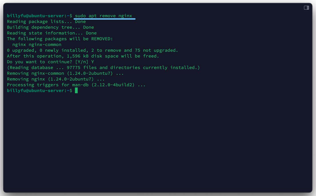 卸载软件包:移除不再需要的软件要卸载已安装的软件包,可以使用apt remove命令。例如,卸载nginx软件包: